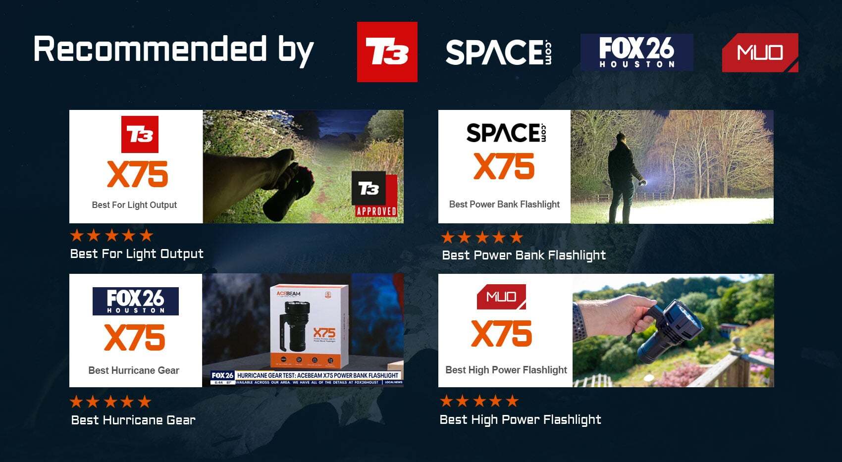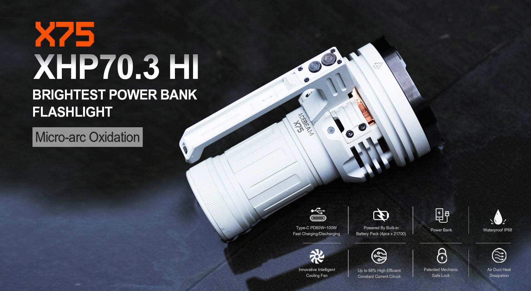 | Package Includes | 1 × Acebeam X75 Micro-arc Oxidation 1 × Built-in 14.4V Li-ion battery pack 1 × USB-C charging cable 1 × 65W USB-C PD power adapter (AU plug) User manual |