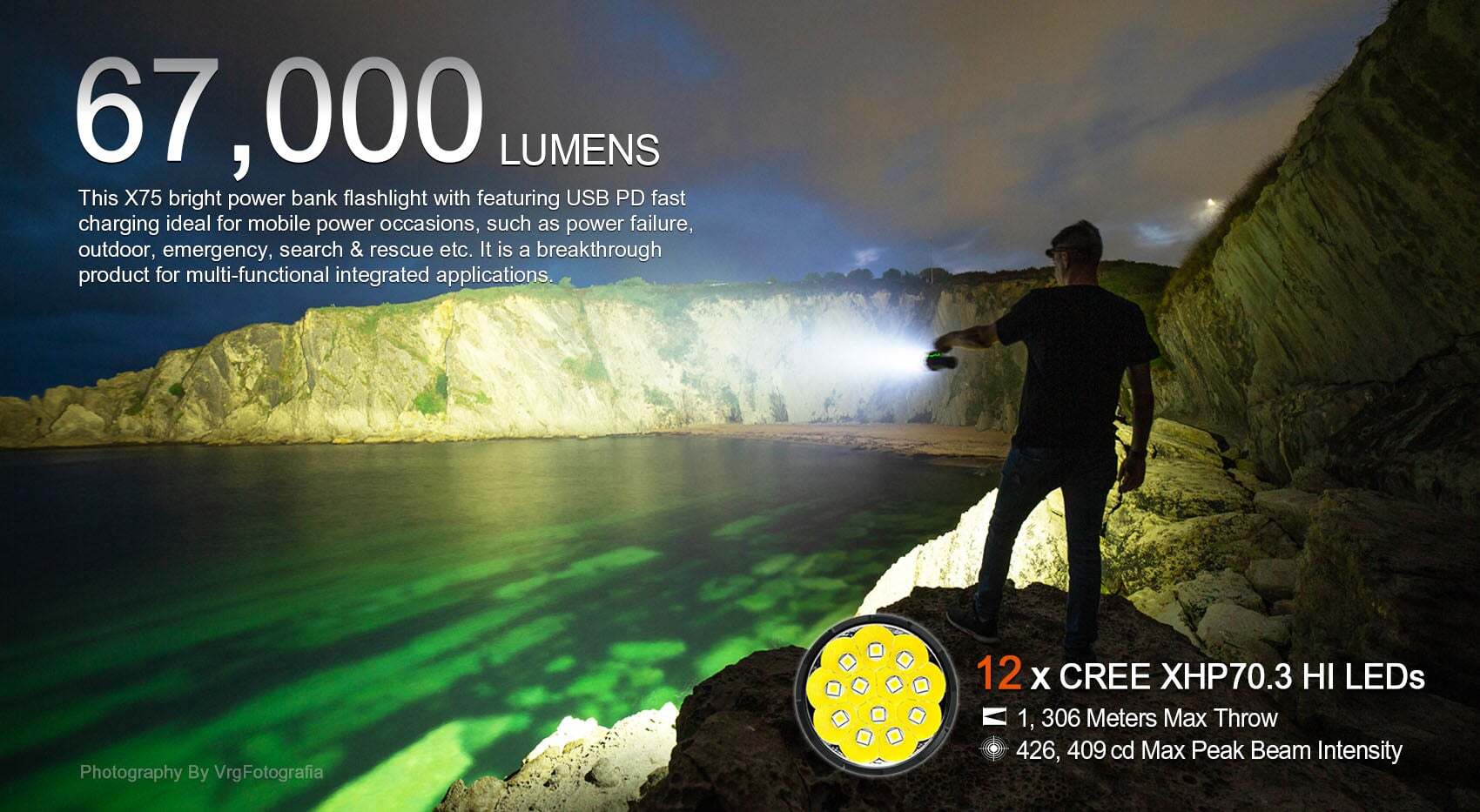 The Acebeam X75 is an ultra-powerful 67,000-lumen rechargeable LED searchlight built for extreme outdoor use, search and rescue, and professional applications. Powered by a built-in 14.4V Li-ion battery pack and advanced 12 × CREE XHP70.3 LEDs, it delivers an impressive 1,306 metre beam distance for long-range illumination. With USB-C PD fast charging, intelligent cooling with a detachable fan, and multiple power modes, the X75 provides outstanding performance, durability, and reliability in demanding environments.