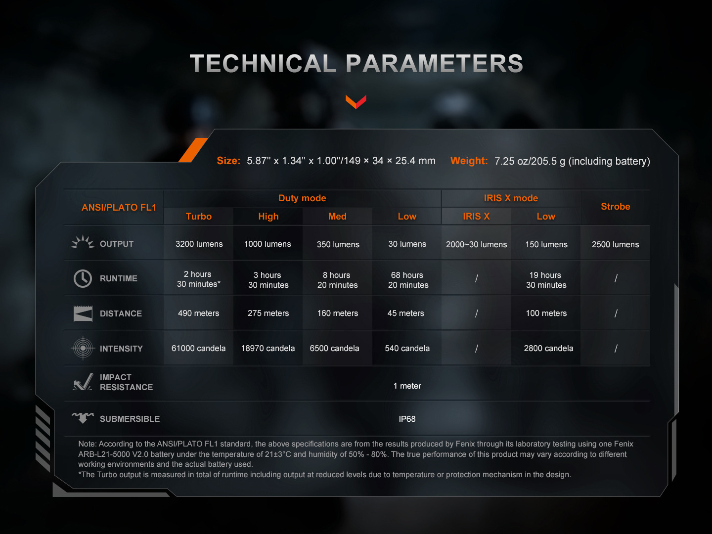 Note: According to the ANSI/PLATO FL1 standard, the above data (not marked with an asterisk) are from the results produced by Fenix through its laboratory testing using two Fenix ARB-L21-5000 V2.0 Li-ion battery under the temperature of 21±3°C and humidity of 50% - 80%. The true performance of this product may vary according to different working environments and the actual batteries used.