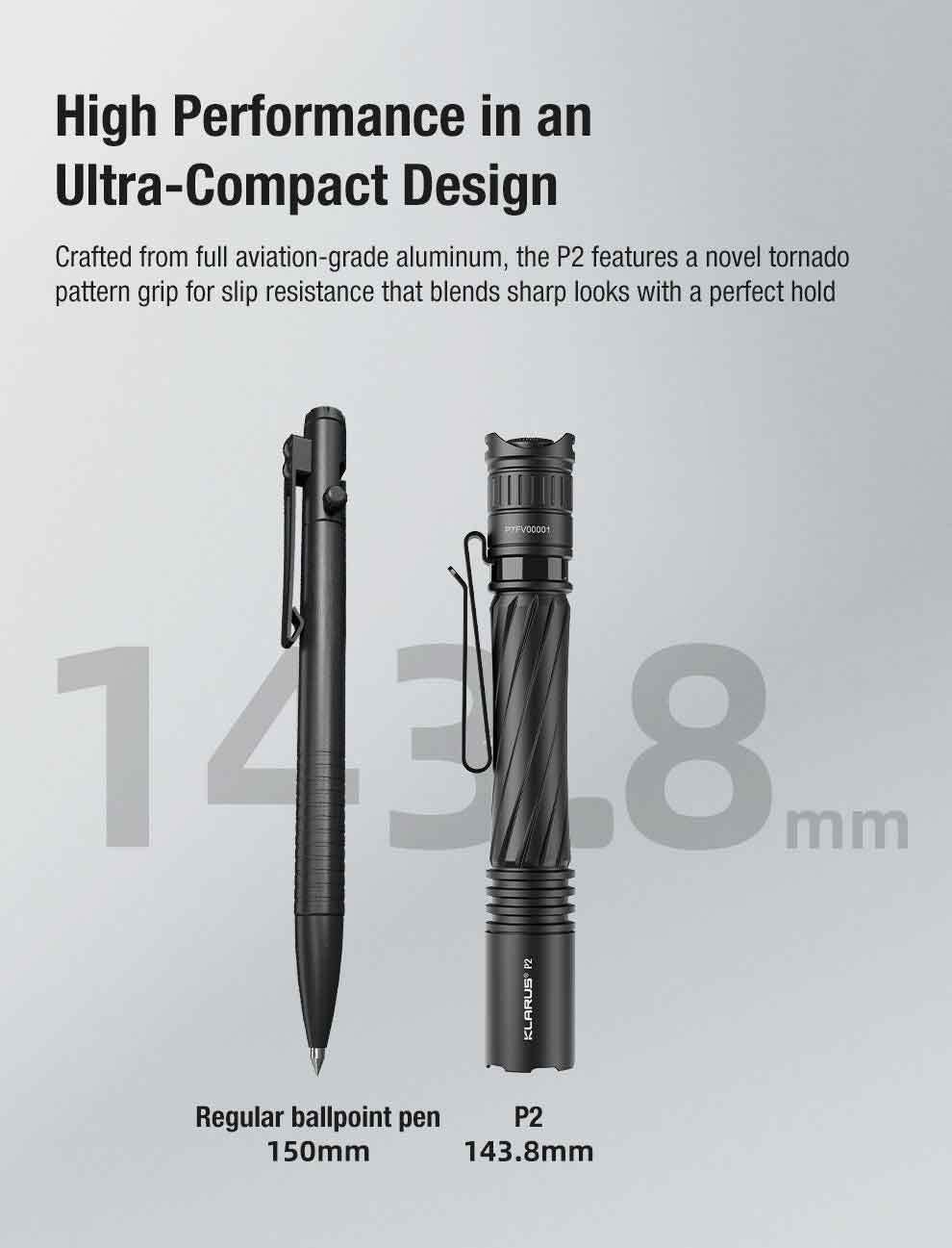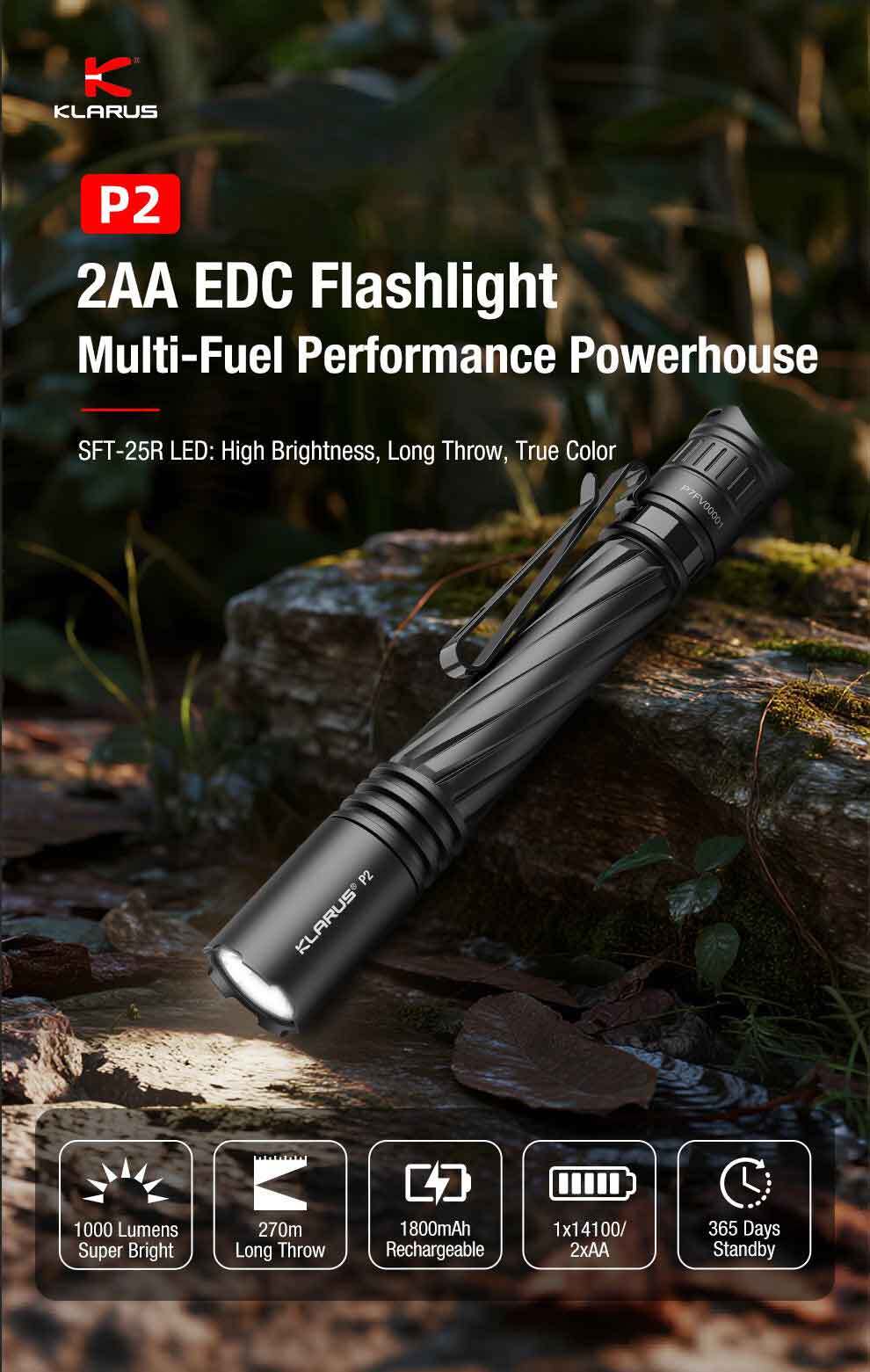 The Klarus P2 is a high-performance EDC torch designed for professionals, outdoor adventurers, and everyday carry. Delivering up to 1000 lumens with versatile dual-fuel support, the P2 runs on either AA batteries or the included rechargeable lithium battery with convenient USB-C charging. Its slim, pocket-friendly design makes it ideal as an inspection torch or backup tactical flashlight while offering durability with IPX8 waterproofing and impact resistance.