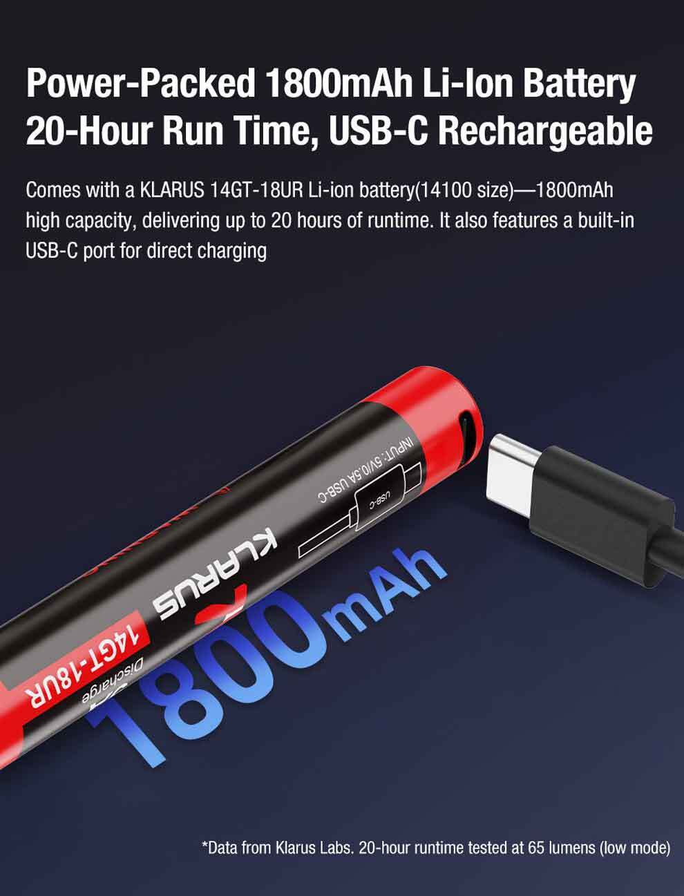 Power Source: 1 × 14100 rechargeable Li-ion battery (USB-C charging) or 2 × AA batteries (alkaline or NiMH)