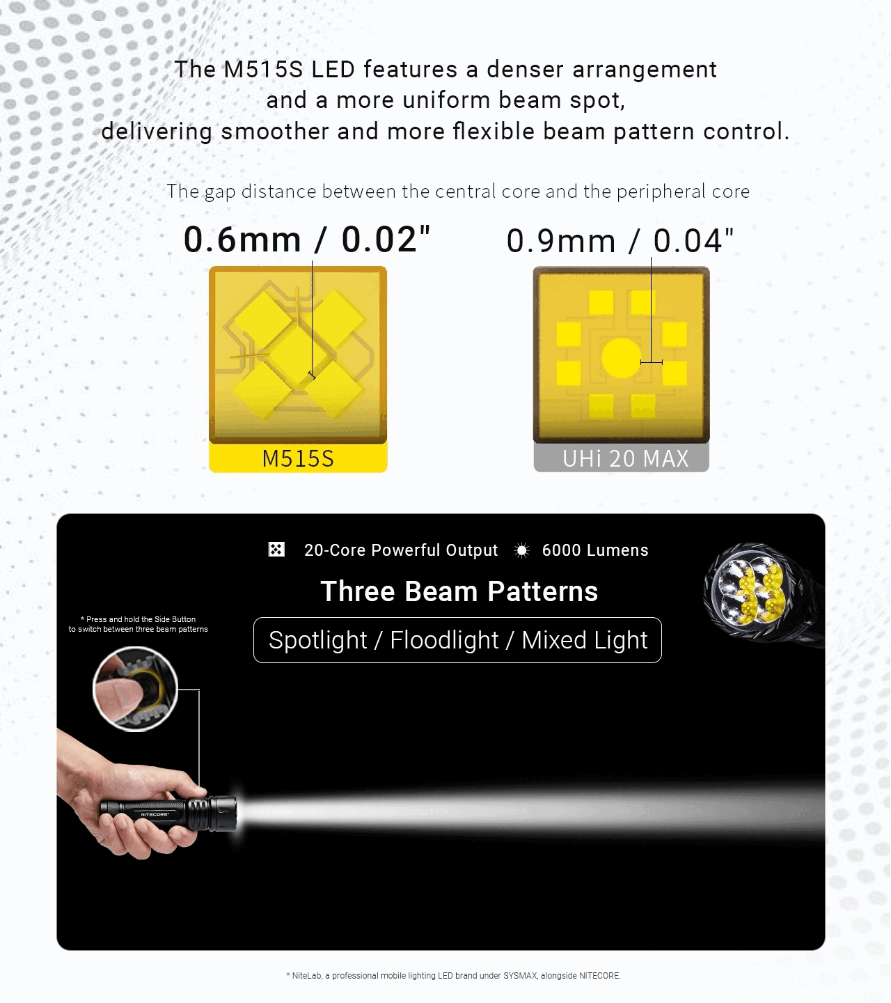 Selectable Spotlight, Mixed Light, and Floodlight modes for any situation.