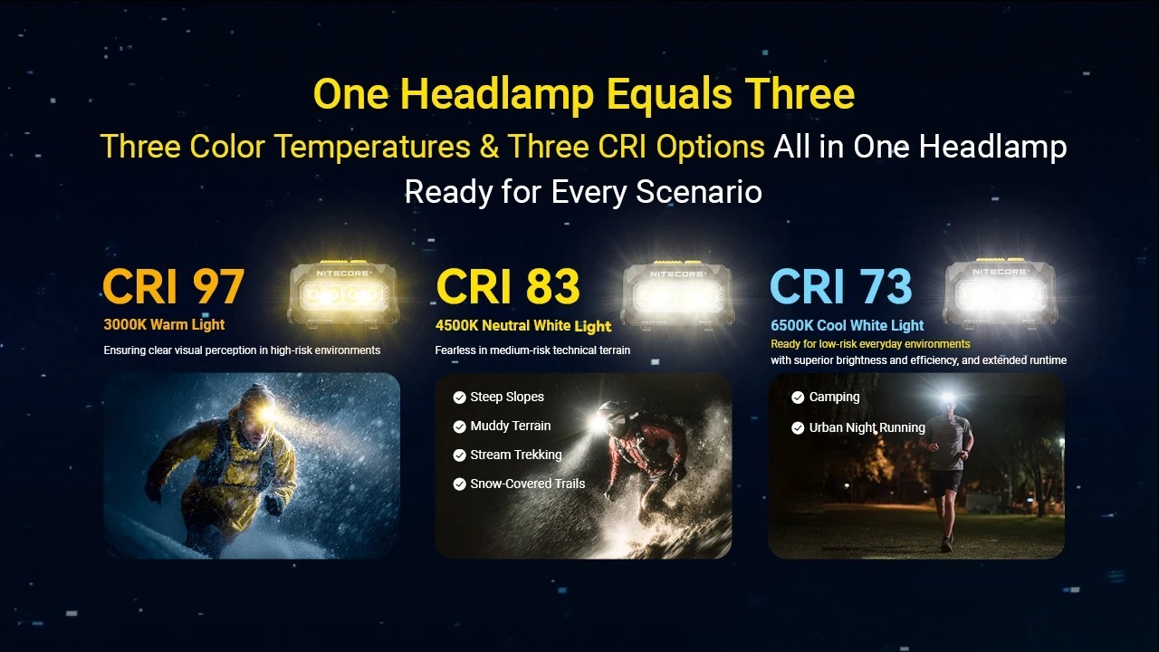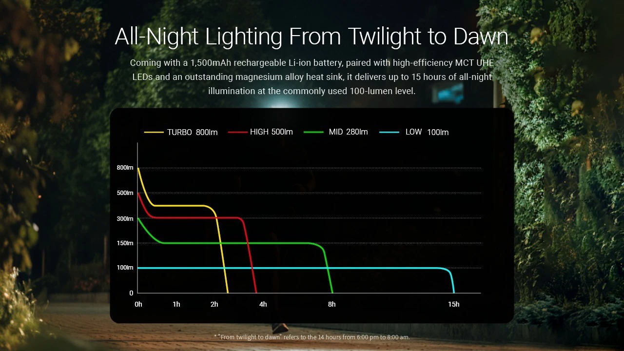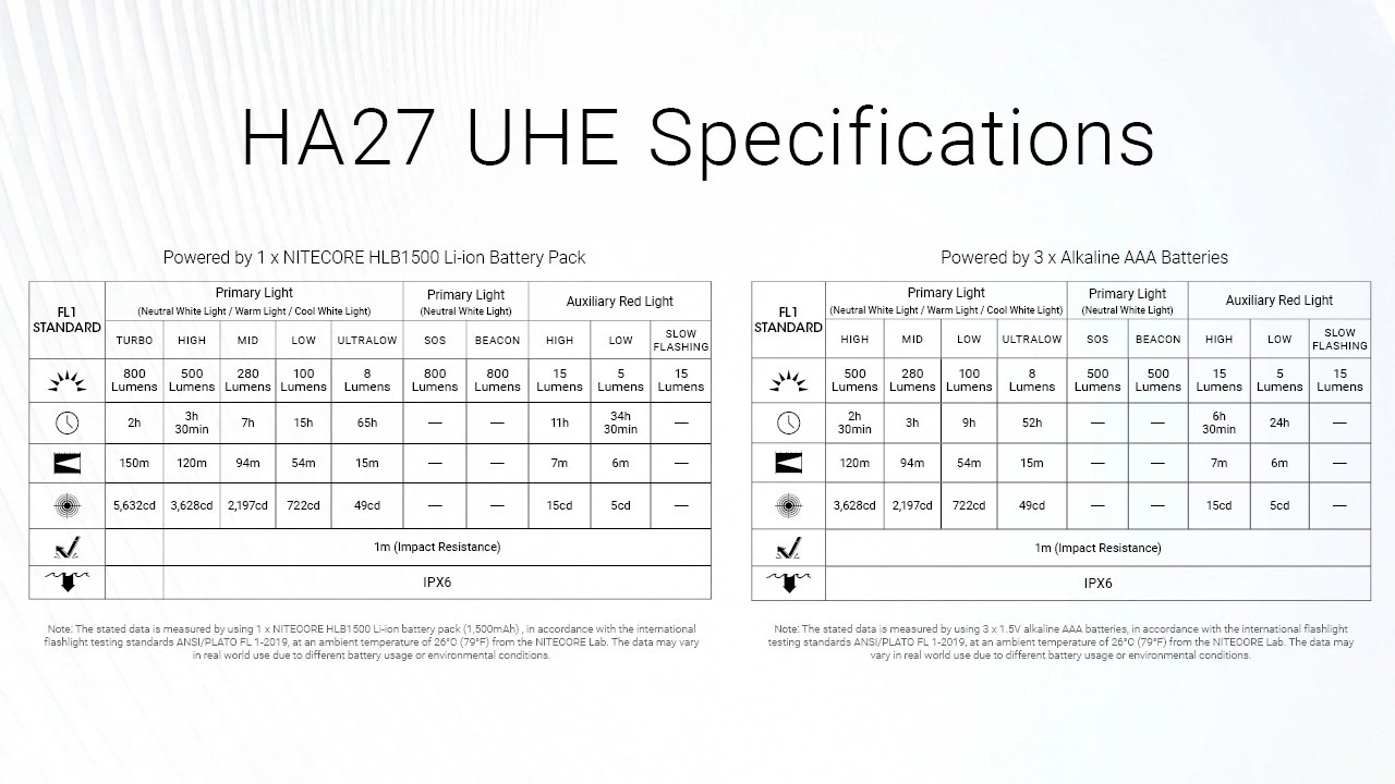 Note: The above data is measured using the NITECORE HLB1500 Li-ion battery pack or AAA batteries in accordance with the international flashlight testing standard ANSI/PLATO FL1-2019 under laboratory conditions. Performance may vary depending on battery type, environmental conditions, and usage.