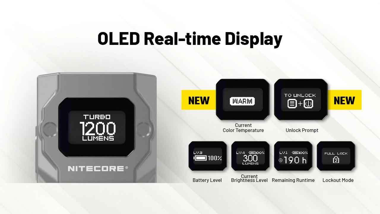 Displays real-time information via OLED screen showing brightness, lumen output, battery status, and remaining runtime.