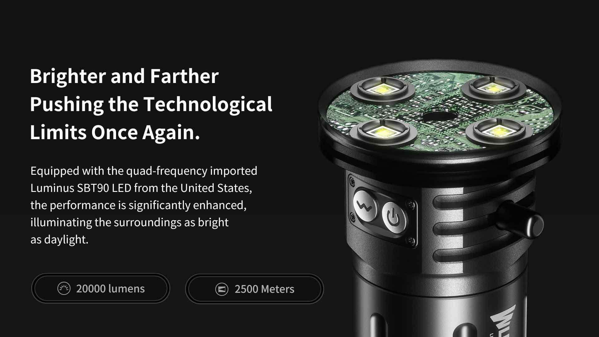 375g, 1,650 Lumens, 360,000cd: The Lumintop PK21-T is a super-bright, ultra-throw spotlight. Powered by a Luminus SFT40 LED and two 21700 Li-ion batteries, it unleashes 1650 lumens with a...