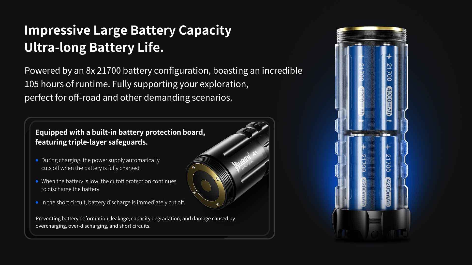 Power Source: Removeable Battery Pack made up of 8 × 21700 built-in rechargeable batteries (33,600mAh total)