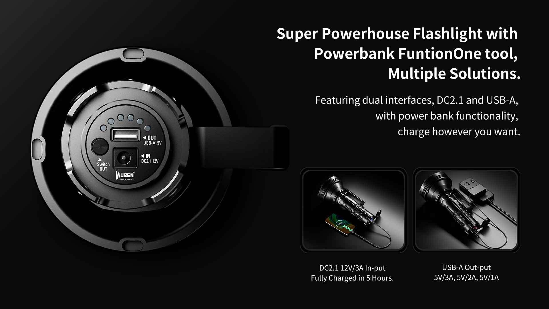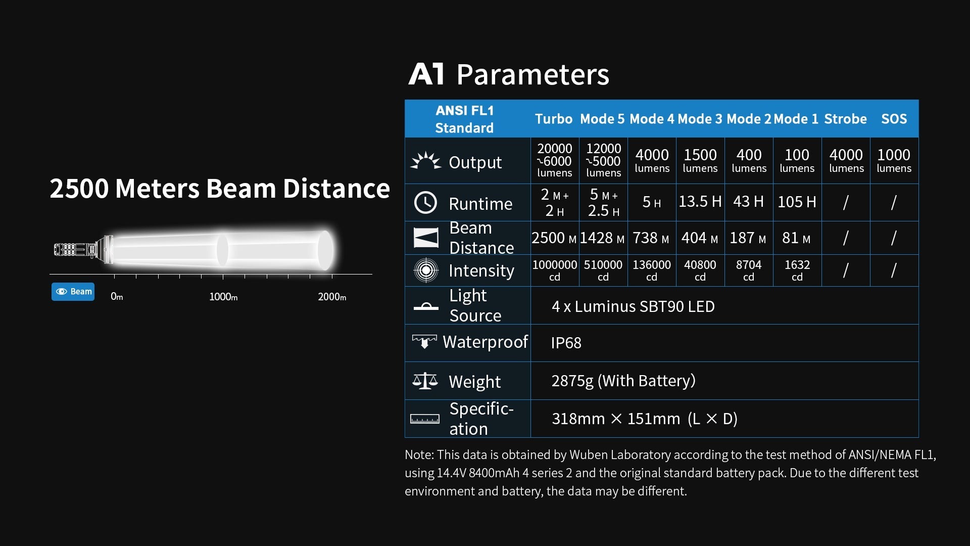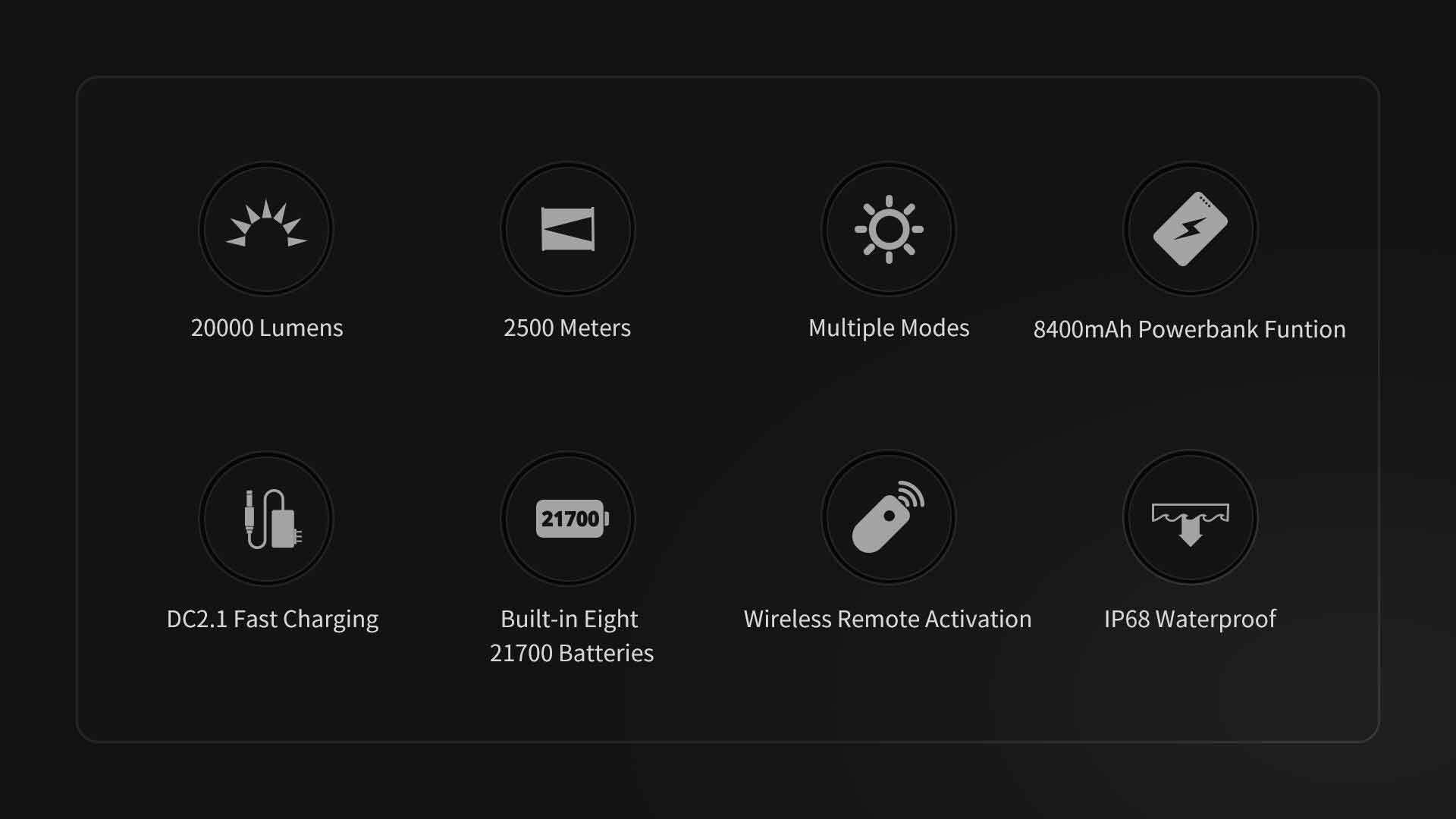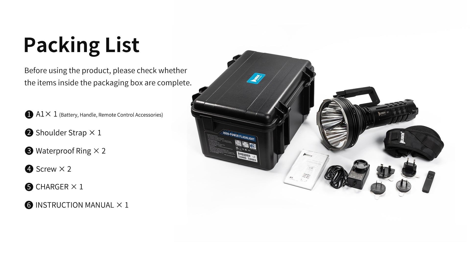 The Wuben A1 Portable Spotlight is one of the world’s brightest handheld searchlights, delivering up to 20,000 lumens with a maximum beam distance of 2,500 metres. Lightweight, compact, and easy to carry, it is perfect for search and rescue, marine operations, caving, or outdoor adventures. Featuring USB charging, remote control functionality, and a removable high-capacity battery pack, the A1 is designed for professionals and enthusiasts who need extreme power, long runtime, and portable convenience.