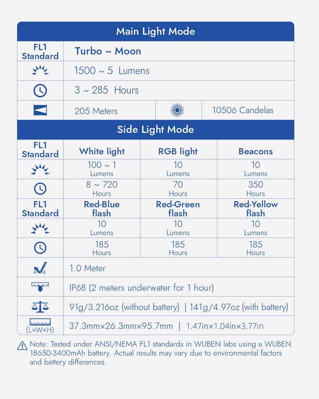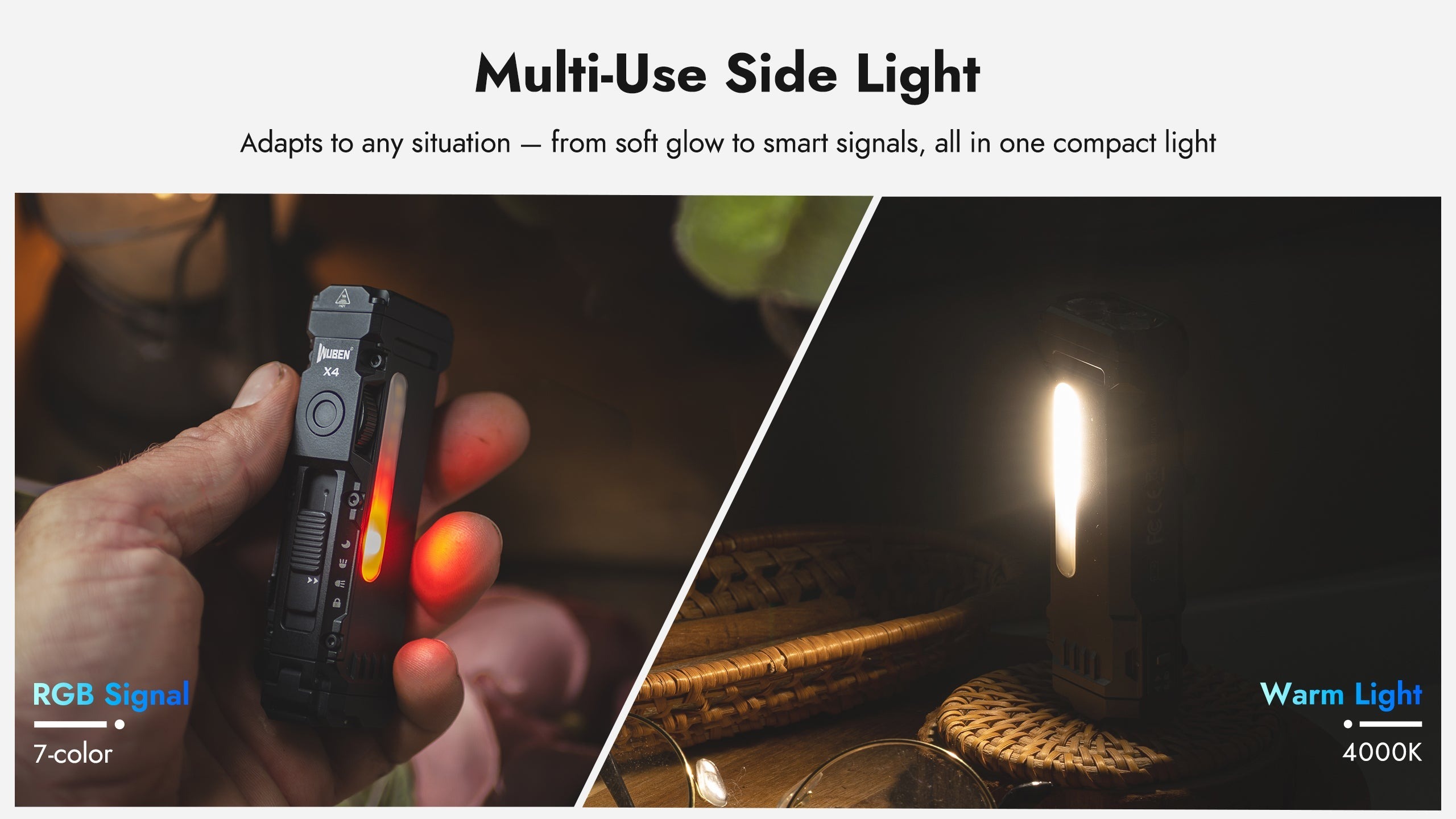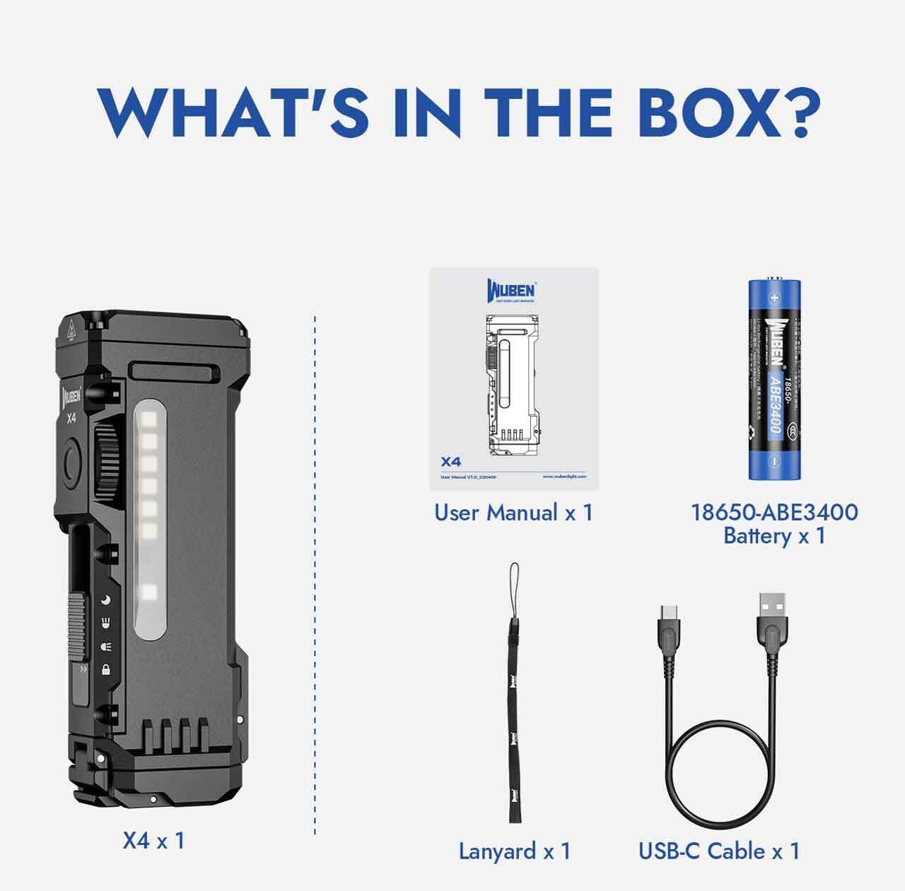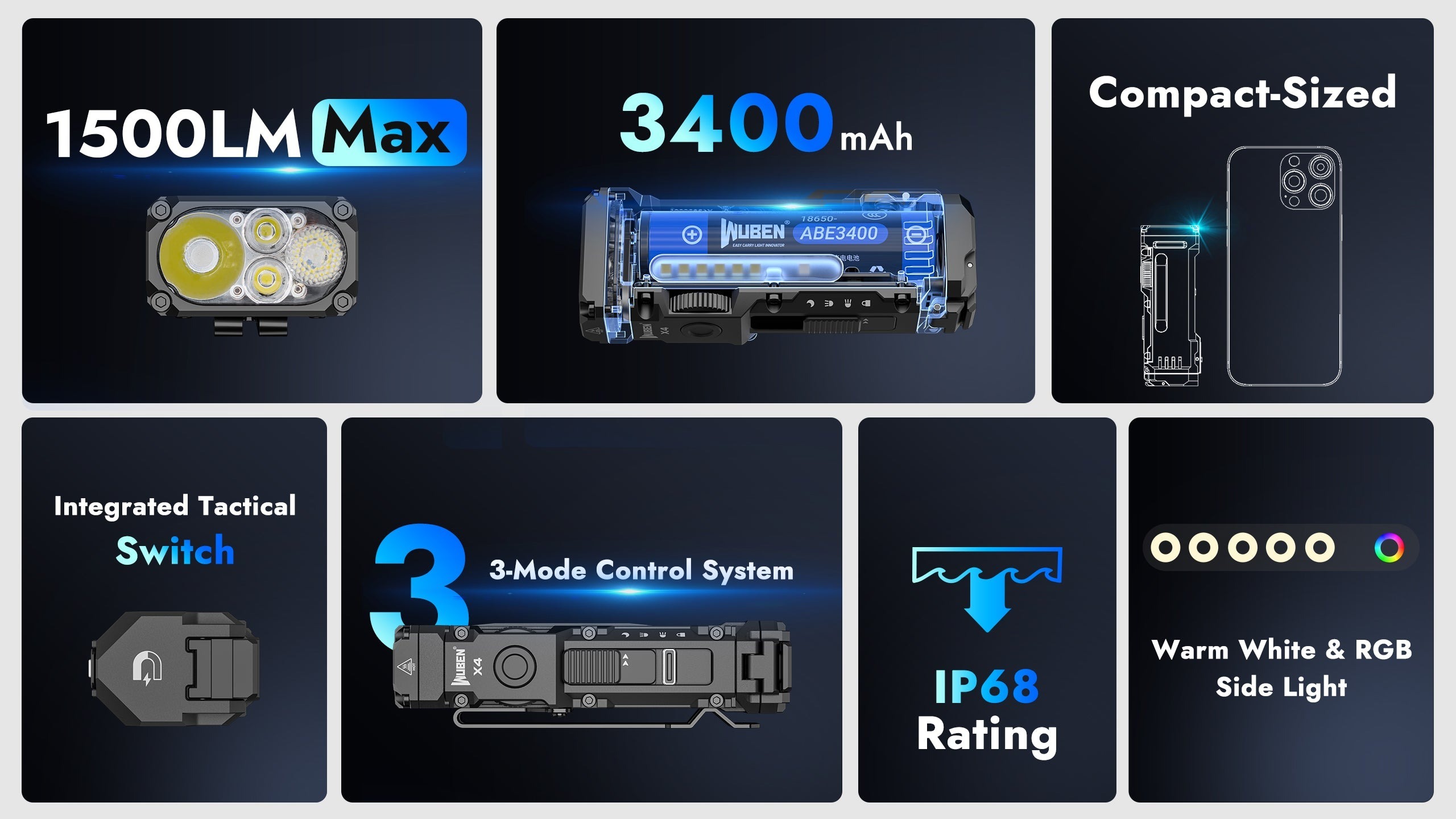 The Wuben X4 is a compact, high-performance dual-light rechargeable torch that delivers both power and versatility in your hand. With a maximum output of 1500 lumens and a beam distance of 205 metres, it’s perfect for EDC, outdoor adventures, camping, cycling, or professional use. Featuring a dual-light design with a main beam and RGB side light, USB-C fast charging, and a rugged IP68 waterproof body, the X4 ensures reliable illumination wherever your journey takes you.